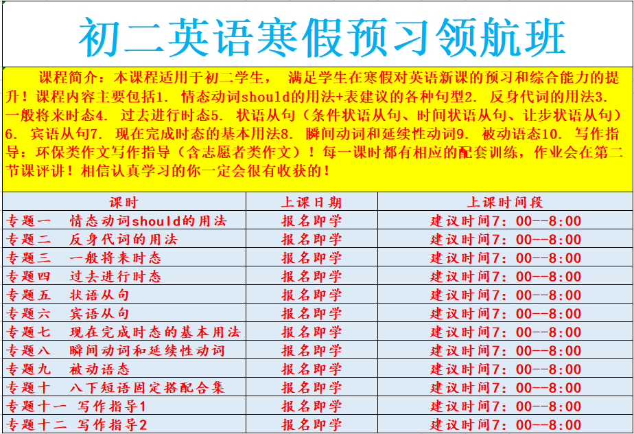 课程简介:本课程适用于初二学生, 满足学生在寒假对英语新课的预习和综合能力的提升!课程内容主要包括1. 情态动词should的用法+表建议的各种句型2. 反身代词的用法3. 一般将来时态4. 过去进行时态5. 状语从句(条件状语从句、时间状语从句、让步状语从句)6. 宾语从句7. 现在完成时态的基本用法8. 瞬间动词和延续性动词9. 被动语态10. 写作指导:环保类作文写作指导(含志愿者类作文)!每一课时都有相应的配套训练,作业会在第二节课评讲!相信认真学习的你一定会很有收获的!