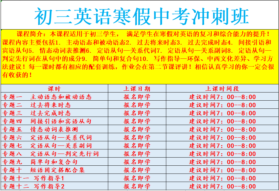 课程简介:本课程适用于初三学生, 满足学生在寒假对英语的复习和综合能力的提升!课程内容主要包括1. 主动语态和被动语态2. 过去将来时态3. 过去完成时态4. 间接引语和宾语从句5. 情态动词表推测6. 定语从句—关系代词7. 定语从句—关系副词8. 定语从句—判定先行词在从句中的成分9. 简单句和复合句10. 写作指导—环保、中西文化差异、学习方法建议!每一课时都有相应的配套训练,作业会在第二节课评讲!相信认真学习的你一定会很有收获的!